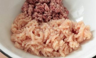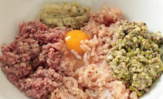 Пропустить через мясорубку обжаренные шампиньоны и лук-порей, одну репчатую луковицу, добавить к фаршу. Добавить яйцо, соль по вкусу и молотую смесь перцев.