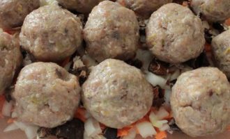 Мокрыми руками сформировать из фарша тефтели, выложить их поверх овощей.