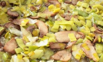 Шампиньоны нарезать пластинами, лук-порей полукольцами. В сковороде с растительным маслом обжарить шампиньоны до испарения жидкости, добавить лук-порей, перемешать и прогреть 2 минуты, остудить.