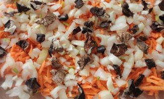 Вторую репчатую луковицу нарезать мелким кубиком, морковь натереть на крупной терке. Я еще добавила горсть сухих грибов(боровики). На дно формы для запекания налить 2 столовые ложки растительного масла, затем слой лука и моркови, грибочки, кусочек лаврового листика.