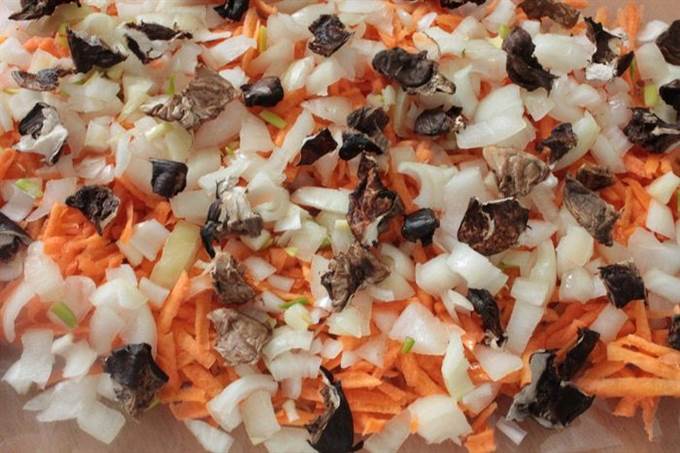 Вторую репчатую луковицу нарезать мелким кубиком, морковь натереть на крупной терке. Я еще добавила горсть сухих грибов(боровики). На дно формы для запекания налить 2 столовые ложки растительного масла, затем слой лука и моркови, грибочки, кусочек лаврового листика.