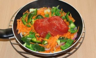 Затем добавить нарезанный перец, помидоры в собственном соку, обжарить 5 -7 минут.