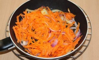 Спассеровать лук на раскаленном растительном масле, добавить натертую на крупной терке морковь.