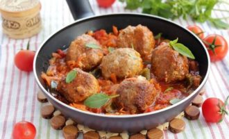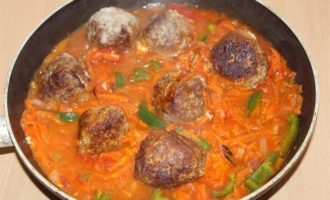 Соединить тефтели с соусом, добавить томатную пасту «Помидорка», сахар, воду, посолить, поперчить и тушить 20 — 25 минут до готовности.