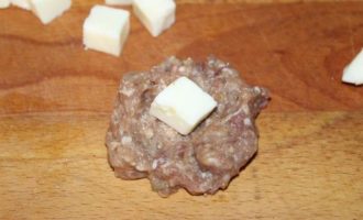Сыр нарезать небольшими кусочками, выложить на кусочки фарша.