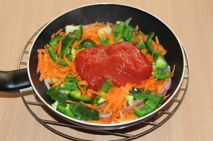 Затем добавить нарезанный перец, помидоры в собственном соку, обжарить 5 -7 минут.