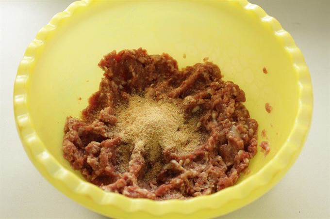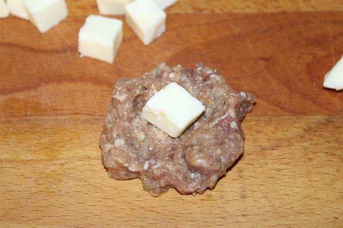 Сыр нарезать небольшими кусочками, выложить на кусочки фарша.