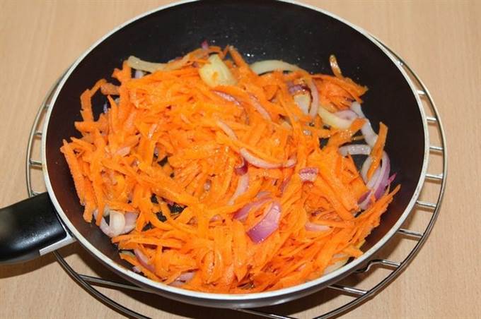 Спассеровать лук на раскаленном растительном масле, добавить натертую на крупной терке морковь.