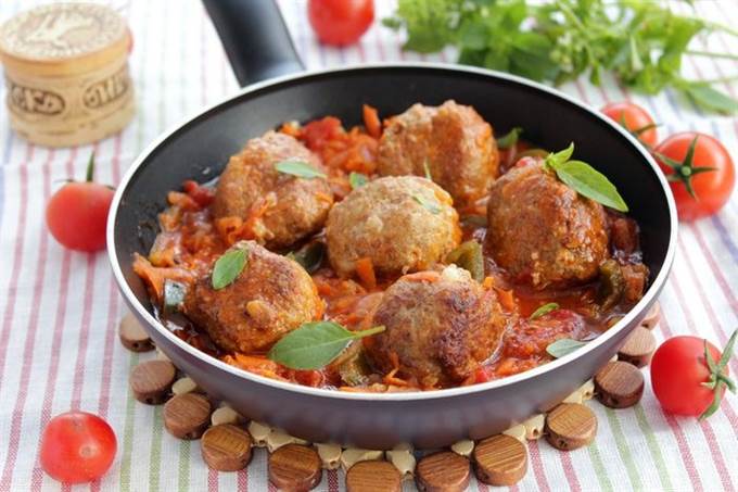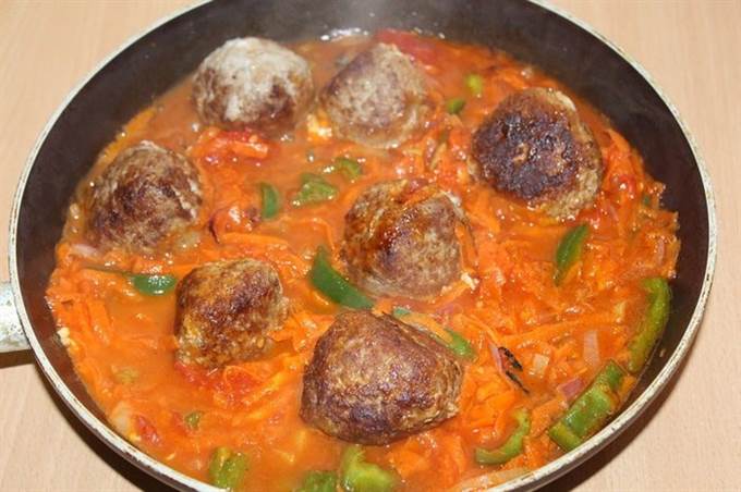 Соединить тефтели с соусом, добавить томатную пасту «Помидорка», сахар, воду, посолить, поперчить и тушить 20 — 25 минут до готовности.