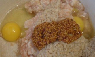• Смешать фарш с мелко порубленным луком, горчицей, яйцом, хлебными крошками. Посолить и поперчить по вкусу.