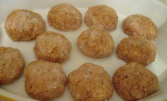 • Сформировать из фарша небольшие шарики (тефтели). Выложить мясные шарики в смазанную растительным маслом форму. Запекать 20-25 минут в разогретой до 200°С, периодически переворачивая тефтели.