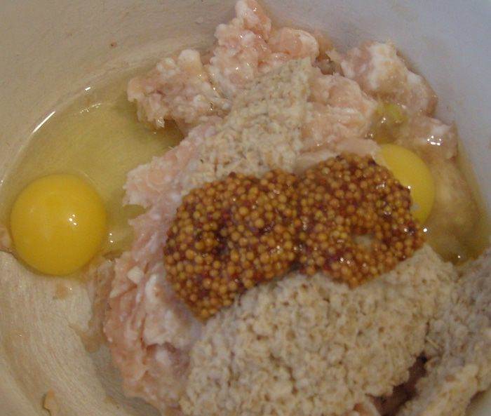 • Смешать фарш с мелко порубленным луком, горчицей, яйцом, хлебными крошками. Посолить и поперчить по вкусу.
