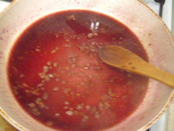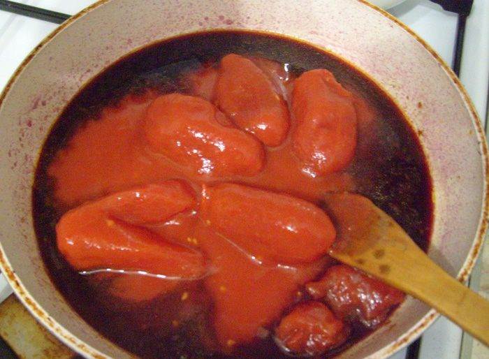 • Консервированные томаты, посолить, довести до кипения. Готовить 15 мин.