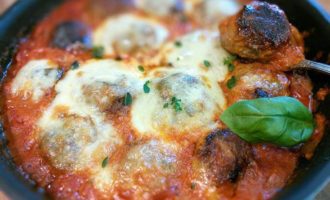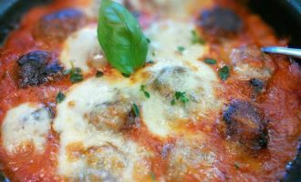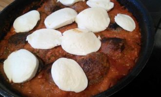 • Моцареллу нарезать тонкими ломтиками и выложить поверх тефтелек.