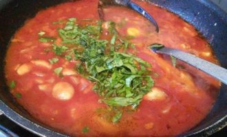 • Влить пассату, добавить зелень. У меня были довольно крупные кусочки кабачков, поэтому мне пришлось пюрировать соус. Если вы натрете его на мелкой терке, то этот шаг можно пропустить. Проварить соус на слабом огне в течении 10 мин.