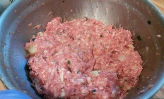 • В фарш добавить горячую зажарку и все тщательно вымешать. Добавить несколько ложек теплой воды при замешивании для сочности.