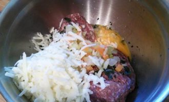 • Готовим фарш: в миске смешать ингредиенты для фарша. Вместо сухарной крошки я добавляю соду, на это количество фарша достаточно 1/4 ч ложки. Если вы не используете соду, то замочите 3 ст. л. сухарей или кусочек старой булочки в 3 ст. л. молока и добавьте в фарш.