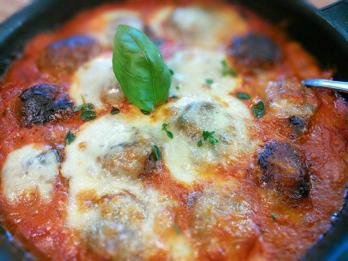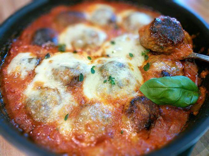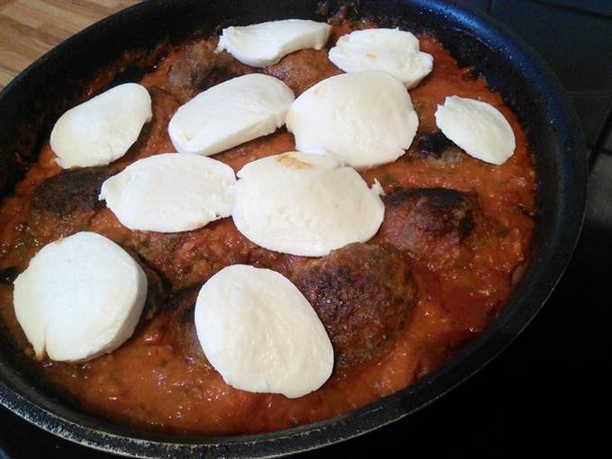 • Моцареллу нарезать тонкими ломтиками и выложить поверх тефтелек.