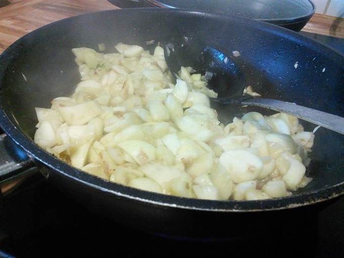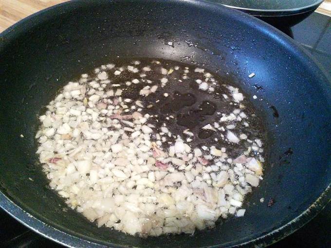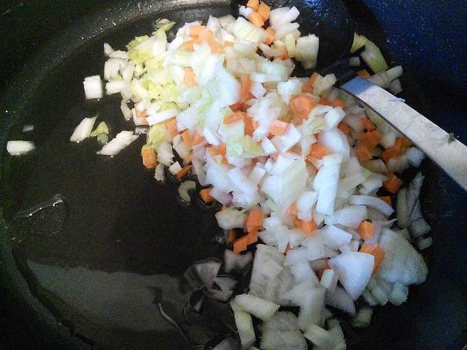 • Пассеруем мелко нарезанные овощи в небольшом количестве подсолнечного масла.