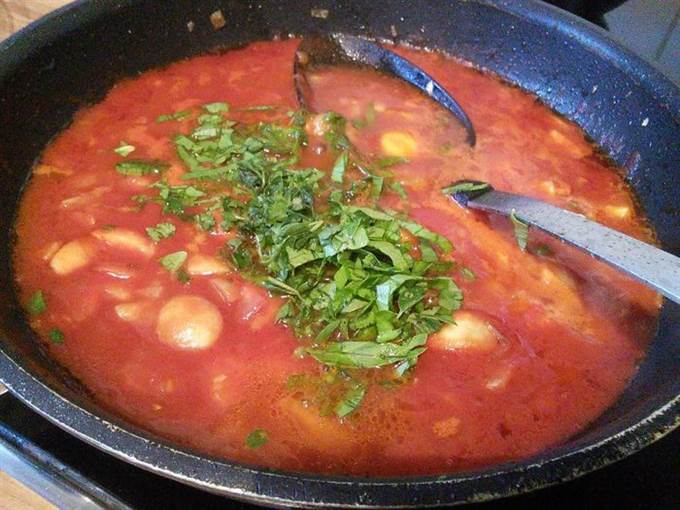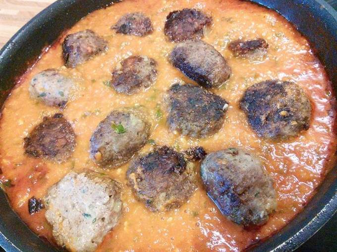 • Разогрейте духовку до 200°С. Соус необходимо посолить, поперчить, добавить сахар и по желанию острый соус чили. Выложить тефтели в соус.