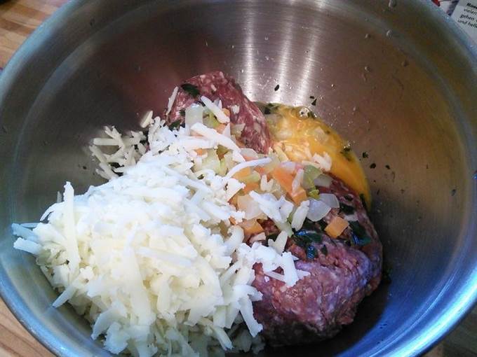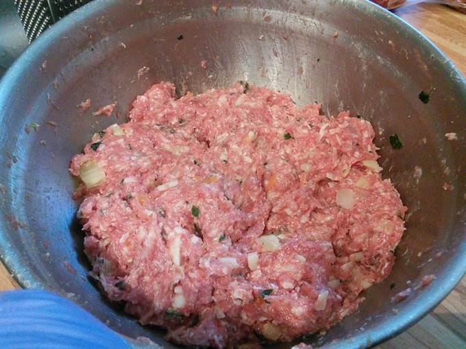 • Готовим фарш: в миске смешать ингредиенты для фарша. Вместо сухарной крошки я добавляю соду, на это количество фарша достаточно 1/4 ч ложки. Если вы не используете соду, то замочите 3 ст. л. сухарей или кусочек старой булочки в 3 ст. л. молока и добавьте в фарш.
