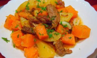 Тыкву нарежьте кубиками, как картофель будет почти готов, добавьте тыкву. Приправы, соль, перец и вустерширский соус. Перемешайте, и готовьте минут 10 до мягкости тыквы.