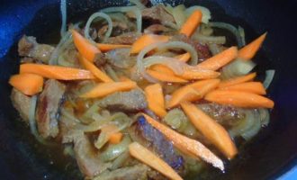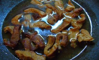 Мясо обжарить на небольшом количестве растительного масла, много не надо так как мясо пустит сок. Я обжариваю на сковороде вок.