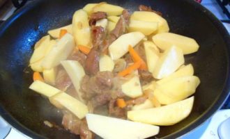 Подержите на гоне минут 5 и добавьте крупно нарезанный картофель.