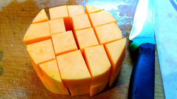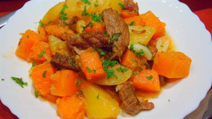 Тыкву нарежьте кубиками, как картофель будет почти готов, добавьте тыкву. Приправы, соль, перец и вустерширский соус. Перемешайте, и готовьте минут 10 до мягкости тыквы.