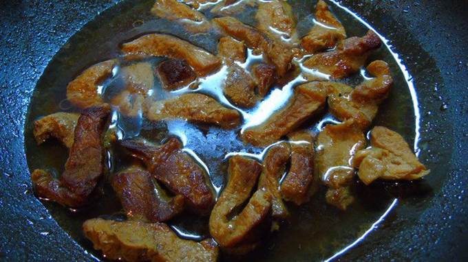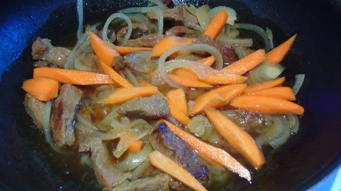 Мясо обжарить на небольшом количестве растительного масла, много не надо так как мясо пустит сок. Я обжариваю на сковороде вок.