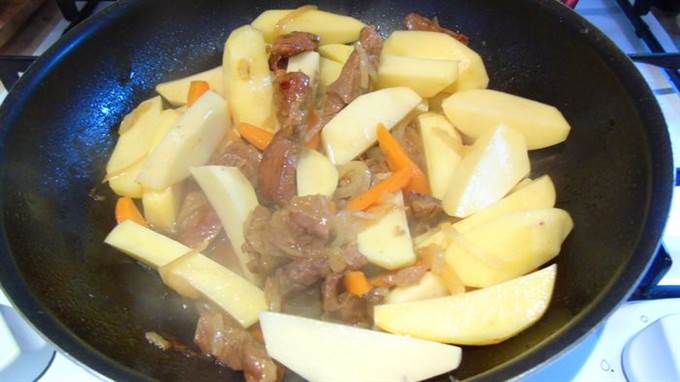 Подержите на гоне минут 5 и добавьте крупно нарезанный картофель.