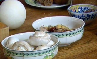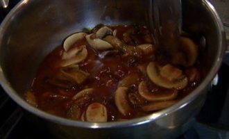 Добавить вино, дать ему слегка выпариться, затем влить горячий бульон и уварить. Загустевший соус протереть через сито, соединить с грибами и прогреть на огне.