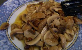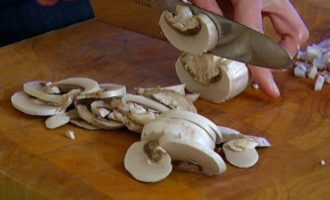 Приготовить соус: разогреть в сковороде оливковое масло и 1 ст. ложку сливочного масла, выложить лесные грибы и шампиньоны, добавить по щепотке соли и смеси перца и слегка обжарить. Затем шумовкой переложить грибы на тарелку (масло должно остаться в сковороде).