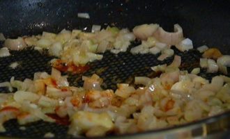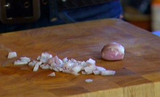 В сковороду, где жарились грибы, добавить оставшееся сливочное масло, выложить шалот и чеснок, добавить кайенский перец и обжаривать, пока лук не станет мягким и прозрачным.