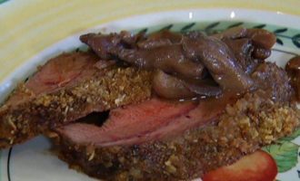 Готовому мясу дать отдохнуть 15 минут, затем нарезать и подавать с грибным соусом.