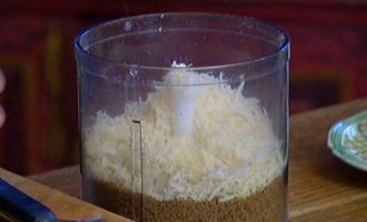 Пармезан натереть на мелкой терке и перемешать с хлебной крошкой.