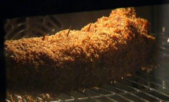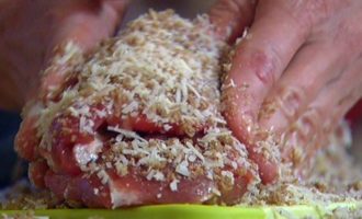 Мясо натереть получившейся заправкой, сложить вдоль пополам, скрепить зубочистками или завязать пищевой нитью и обвалять со всех сторон в хлебно-пармезановой крошке.