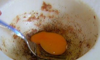 Анчоус, 1 очищенный зубчик чеснока, щепотку соли и смеси перца растереть в ступке в однородную массу. Затем добавить яйцо и перемешать.