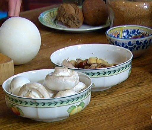 Добавить вино, дать ему слегка выпариться, затем влить горячий бульон и уварить. Загустевший соус протереть через сито, соединить с грибами и прогреть на огне.