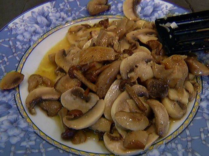 Приготовить соус: разогреть в сковороде оливковое масло и 1 ст. ложку сливочного масла, выложить лесные грибы и шампиньоны, добавить по щепотке соли и смеси перца и слегка обжарить. Затем шумовкой переложить грибы на тарелку (масло должно остаться в сковороде).
