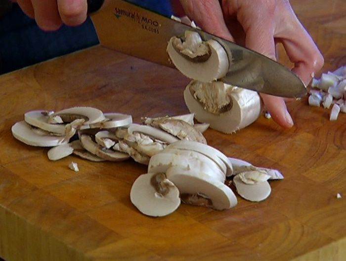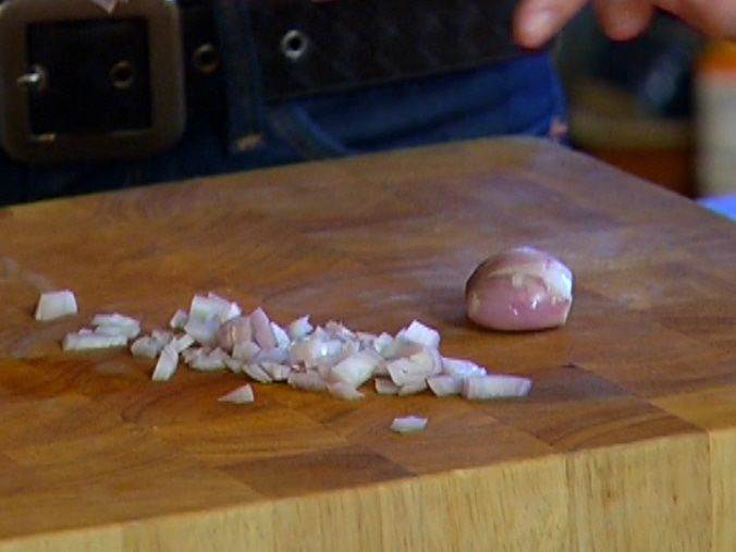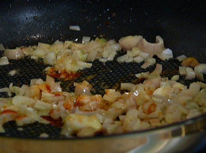 В сковороду, где жарились грибы, добавить оставшееся сливочное масло, выложить шалот и чеснок, добавить кайенский перец и обжаривать, пока лук не станет мягким и прозрачным.