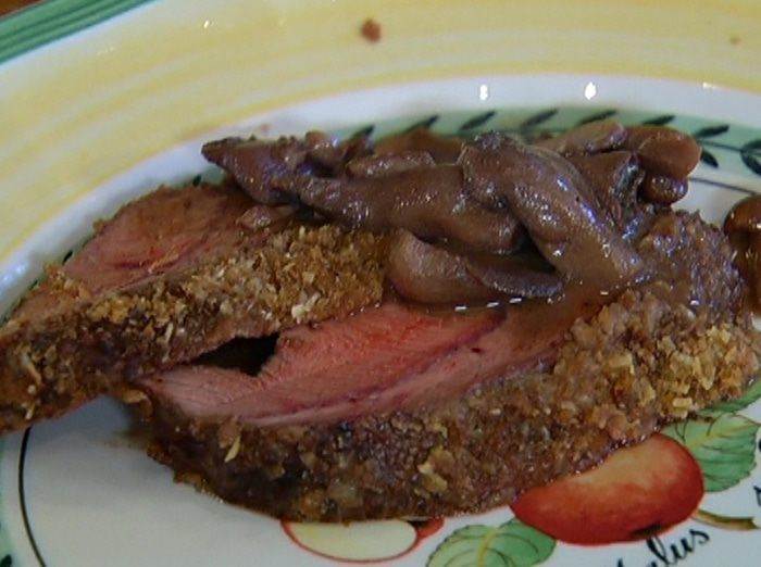 Готовому мясу дать отдохнуть 15 минут, затем нарезать и подавать с грибным соусом.