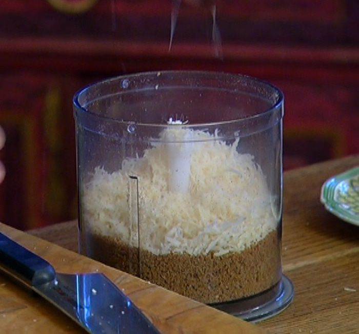 Пармезан натереть на мелкой терке и перемешать с хлебной крошкой.