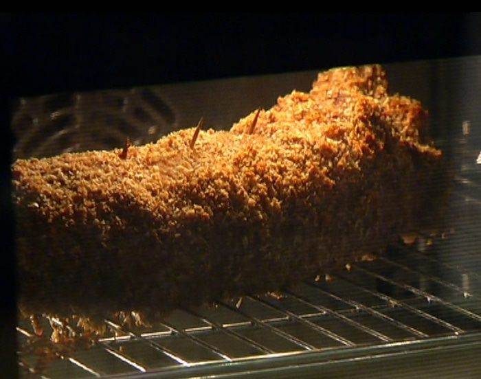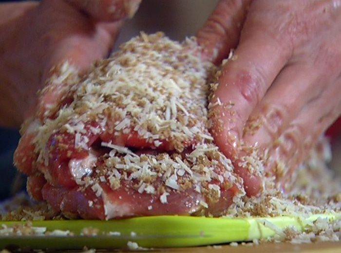 Мясо натереть получившейся заправкой, сложить вдоль пополам, скрепить зубочистками или завязать пищевой нитью и обвалять со всех сторон в хлебно-пармезановой крошке.
