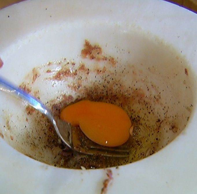 Анчоус, 1 очищенный зубчик чеснока, щепотку соли и смеси перца растереть в ступке в однородную массу. Затем добавить яйцо и перемешать.