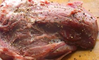 Телятину просушить бумажной салфеткой и натереть подготовленной смесью специй и соли.