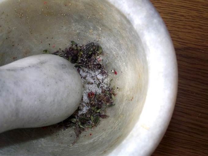 Все сухие специи растолочь в ступке.