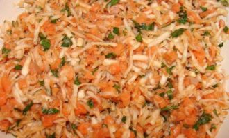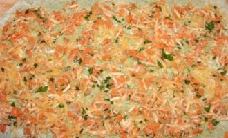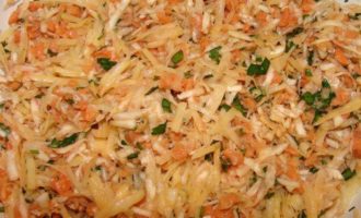 Очистить и потереть на крупной терке корень сельдерея, добавить к рыбе.