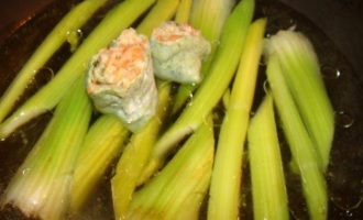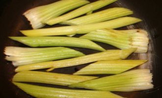 В глубокую сковороду выложить стебли сельдерея. Они не датут роллам пристыть ко дну и усилят вкус!