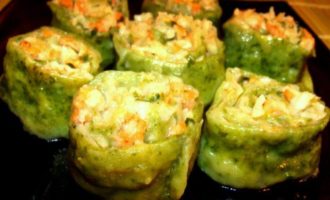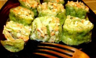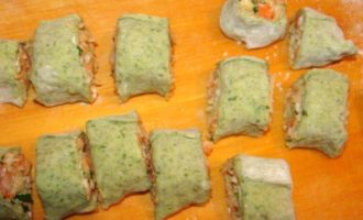 Для последующих порций воду в сковороду нужно каждый раз добавлять. Стебли оставляем на месте до последней порции, потом выбрасываем. У меня получилось 5 роллов и 7 порций из них. Еще одна порция пасты.